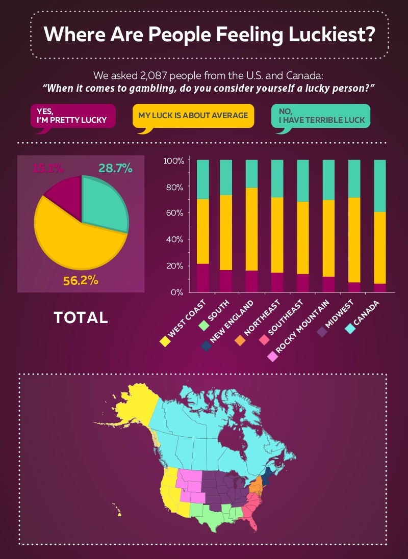 Jak uczucie szczęścia wpływa na wizyty w kasynie? Badanie wykazało kilka interesujących różnic regionalnych. Ludzie z Zachodniego Wybrzeża chodzą do kasyn częściej niż mieszkańcy jakiegokolwiek innego regionu , prowadząc kontynent zarówno w grach automatowych, jak i stołowych.