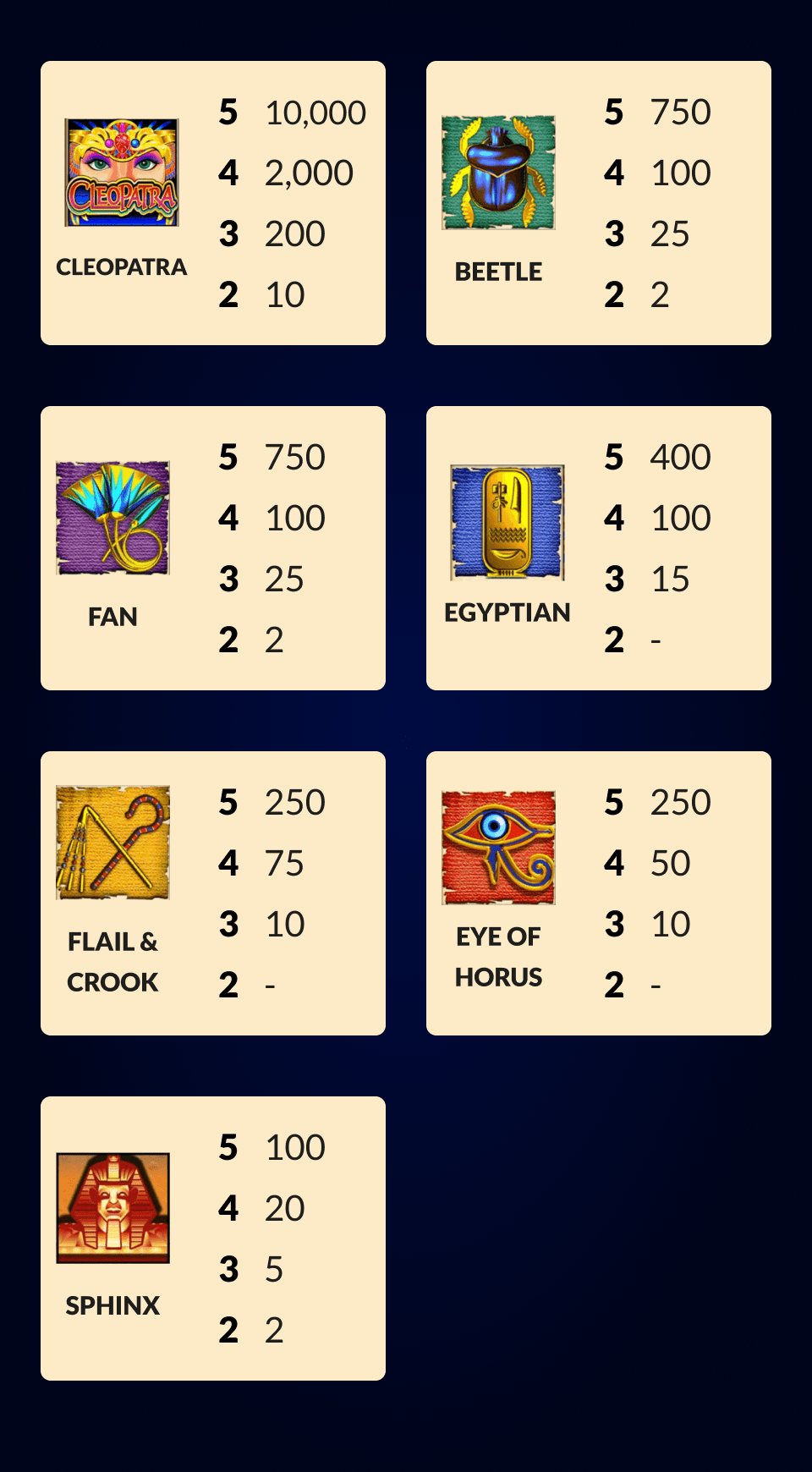 Najbardziej opłacalne symbole w grze to Kleopatra, Skarabeusz i egipskie hieroglify. Niżej płatne symbole to Flail, Crook Of Ozyris i Eye of Horus.