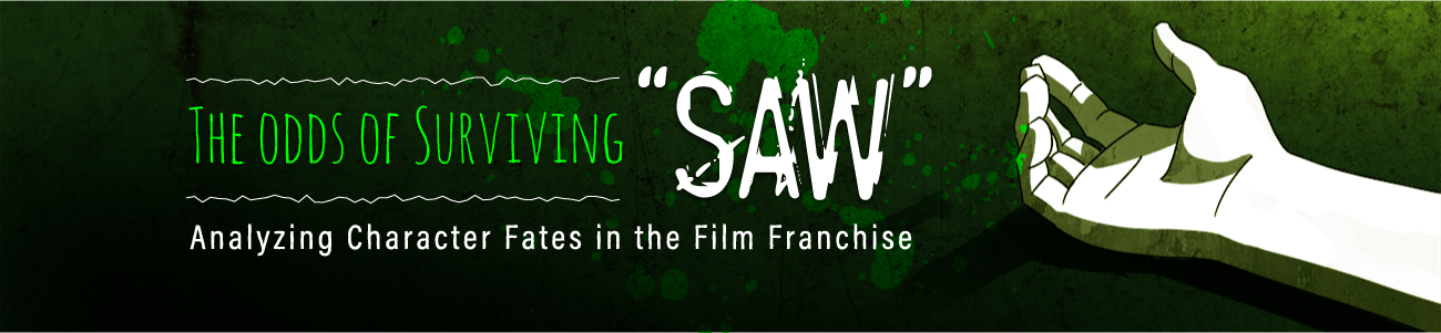Zbadaliśmy 77 zgonów z pierwszych sześciu filmów " Piła "i" Piła 3D". niektóre zgony postaci (Dylan Denton, Gideon Kramer i Harold Abbott) miały miejsce jako część fabuły filmu i nie były częścią gier Jigsawa. Tych zgonów nie uwzględniliśmy w naszych obliczeniach.
