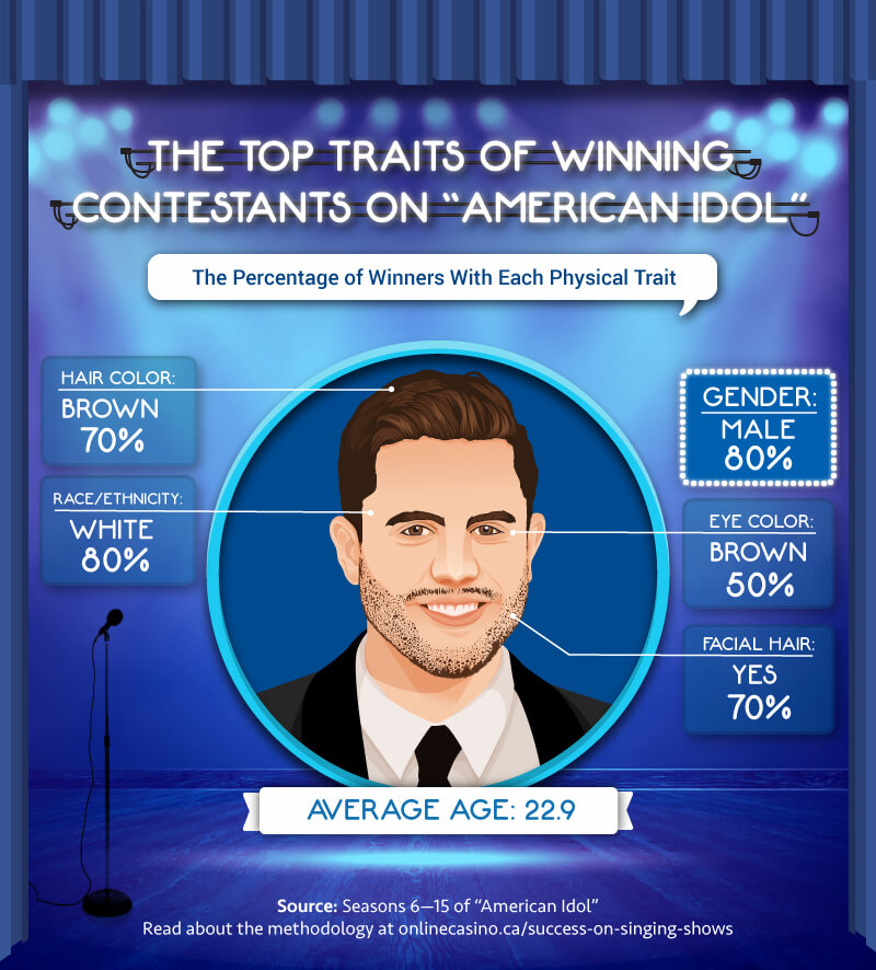 Innymi wspólnymi cechami zwycięzców z 10 sezonów programu "Idol" były zarost na twarzy-siedmiu z 10 zwycięzców w ostatniej dekadzie serialu miało brodę lub zarost, kiedy wygrali-jak David Cook, Kris Allen i Lee DeWyze, którzy wygrali odpowiednio w sezonach 7-9. W rzeczywistości jedynymi zwycięzcami na przestrzeni lat, które analizowaliśmy, były kobiety, takie jak Candice Glover (sezon 12) i Jordin Sparks (sezon 6), wraz z clean-cut songsmith Scotty McCreery (sezon 10).