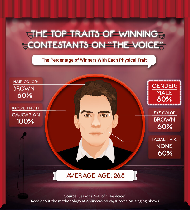 Z ostatnich pięciu sezonów wszyscy zwycięzcy byli rasy białej, a 3 na 5 miało brązowe włosy lub brązowe oczy. Podczas gdy średnia wieku zwycięzców "American Idol" była poniżej 23 lat, zwycięzcy "The Voice" byli bardziej skłonni do pchania 29 w momencie triumfu. Zawodnicy tacy jak Craig Wayne Boyd i Jordan Smith prowadzą falę zwycięzców wyciętych z podobnych materiałów – białych mężczyzn o brązowych włosach i brązowych oczach. Poza Boydem I Head, większość zwycięzców zdecydowała się na czysty wygląd twarzy.